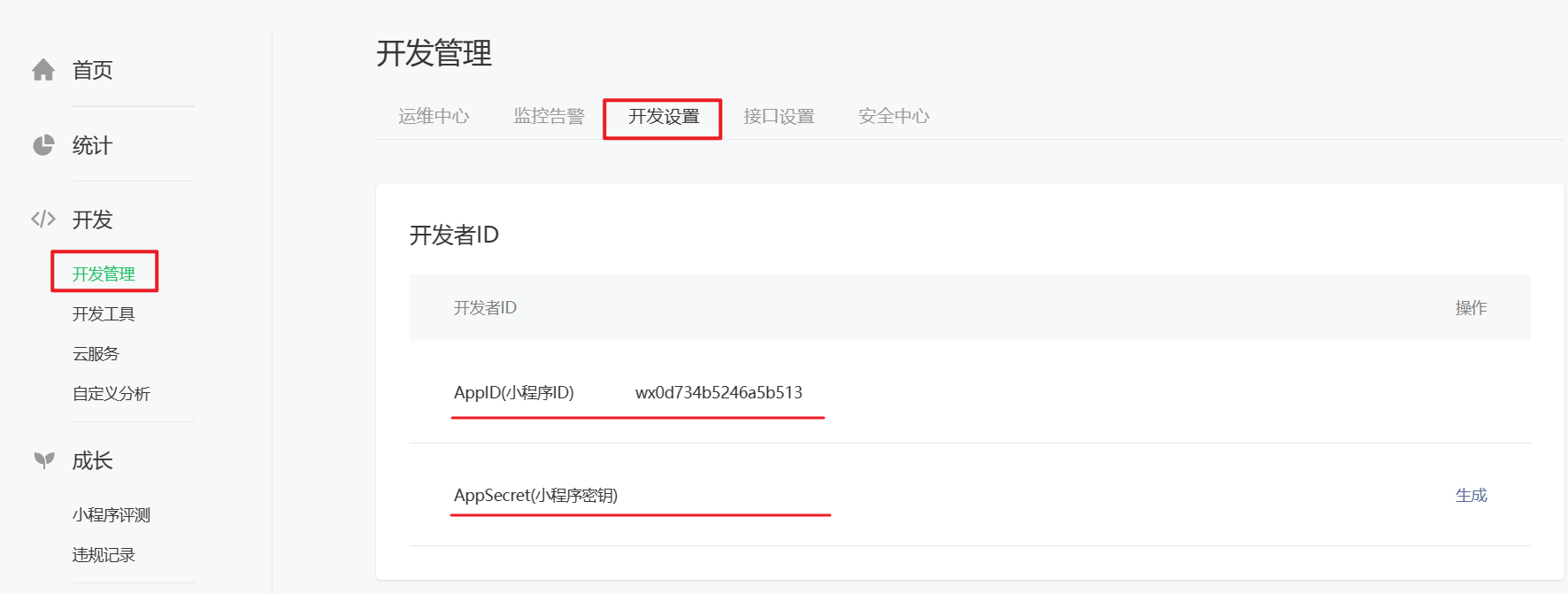 在微信公众后台,单击左侧开发标签,选择 “开发管理”,在新的页面中点击 “开发设置”,就可以看到开发者 ID 信息。请妥善保管你的小程序 ID 和小程序密钥,在后续的开发中会经常使用到,获取位置见下图: