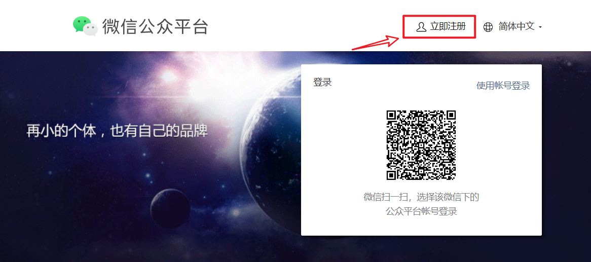 打开 微信公众平台,点击立即注册