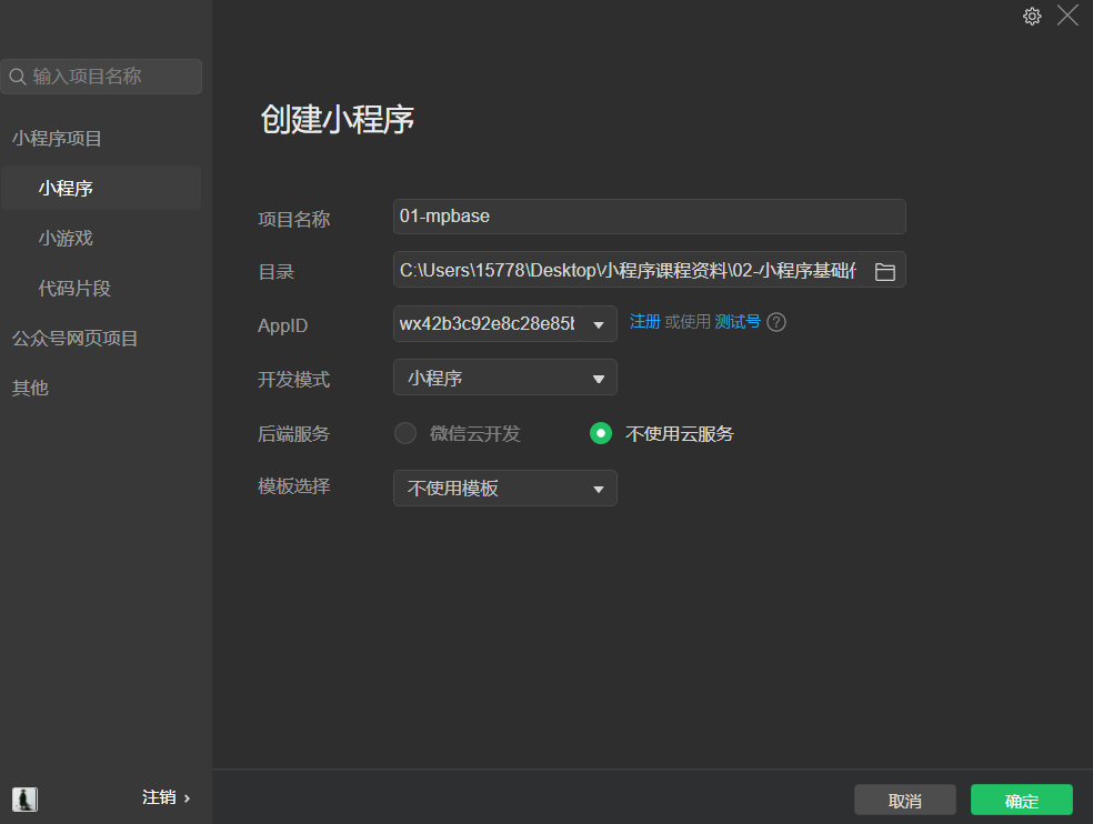 - 开发模式:选择小程序
