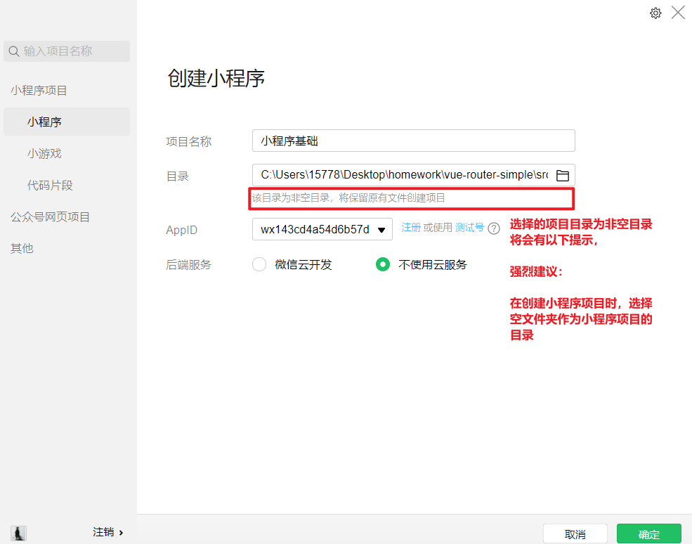 - 目录:选择小程序开发文件夹,注意:小程序的目录建议是空目录,否则官方会有提示,见下图