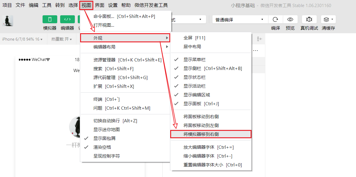 将小程序模拟器移动右侧:点击菜单栏的 视图 ➡ 外观 ➡ 将模拟器移到右侧,小程序模拟器即可调整到右侧