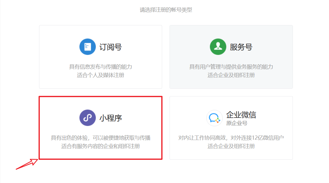 选择注册的帐号类型,在这里我们需要 选择小程序