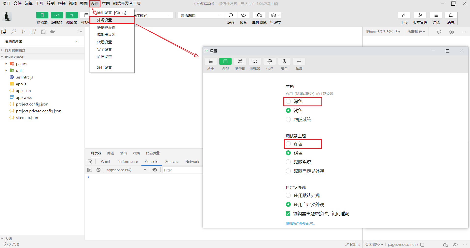 小程序主题设置,点击菜单栏的 设置 ➡ 外观设置 ➡ 在弹框中将主题和调试工具选择为深色