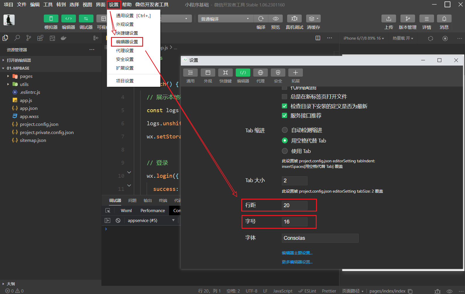 编辑区的设置,点击菜单栏的 设置 ➡ 编辑器设置 ➡ 按照自己的洗好调整行距和字号,或者其他设置