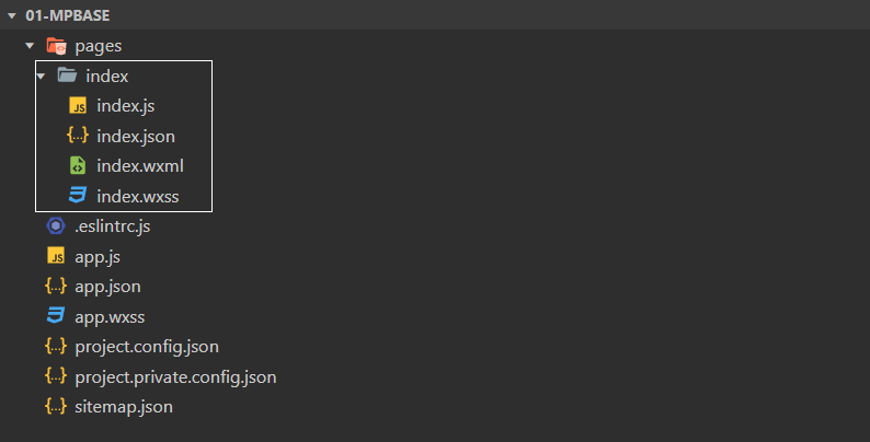 页面文件 是每个页面所需的文件,小程序页面文件都存放在 pages 目录下,一个页面一个文件夹,每个页面通常由四个文件组成,每个文件只对当前页面有效: