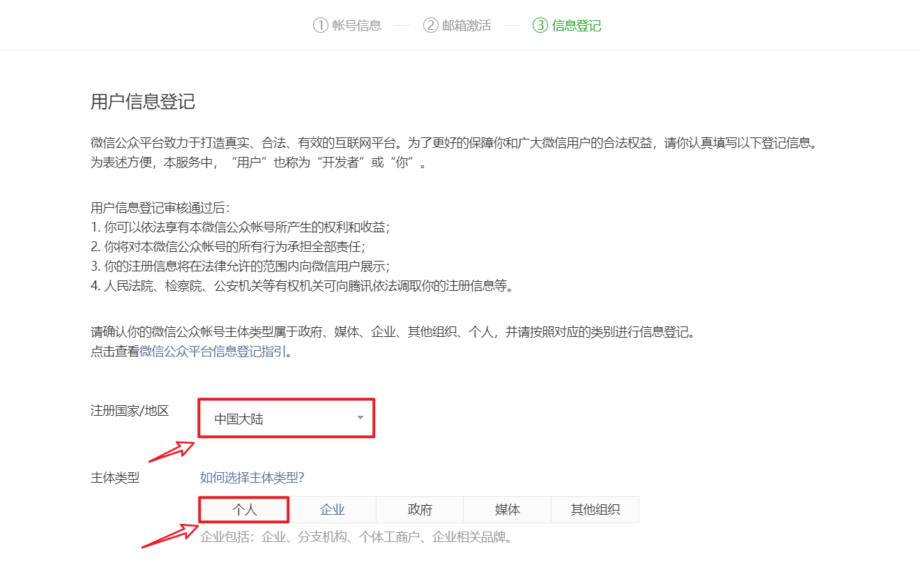 信息登记,注册类型 (需要选择中国大陆和个人,企业其他需要资质认证)
