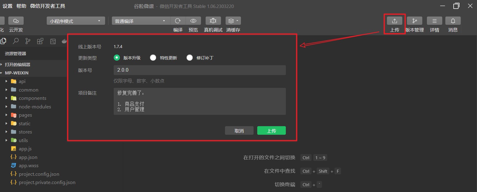小程序开发成员在开发者工具中点击 上传 按钮,在弹出的界面中选择更新类型、版本号、项目备注,就能够将小程序代码上传至微信公众号后台审核。
