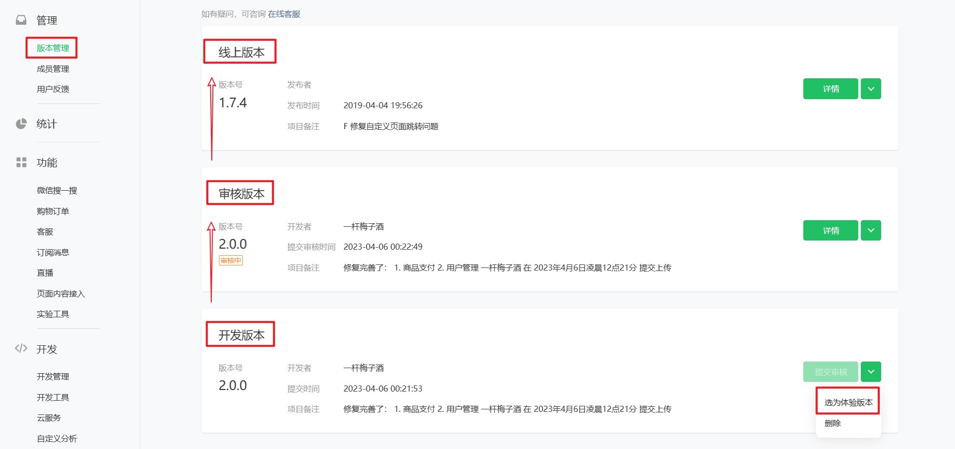 在登录到微信公众后台以后,点击左侧的 管理 ➡ 版本管理,就能查看小程序的四个个版本
